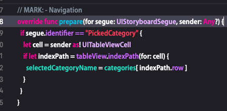 ์์). ์ ๋ ์ ๊ณผ ๋์์ unwind segue๊ฐ ์คํ๋๊ณ , ์์ ์คํฌ๋ฆฐ์ ๋ฐ์ selectedCategoryName๊ฐ์ ์ทจํ๋ ๊ฒ์ผ๋ก ๋์ด์์ด, ํน์ ์ ์ด ์ ํ๋ ๋ selectedCategoryName์ด ์ ํํ ์ธ๋ฑ์ค์ ๋ฐ๋ผ ์ ๋ฐ์ดํธ ๋๋ ์ ์ฐจ๊ฐ ์์์ต๋๋ค. ๊ทธ ๊ฐ๊ทน์ ๋ฉ์์ฃผ๋ ๊ณณ์ด, ๋ฐ๋ก ๋ณด๋ด๋ ์ชฝ์ "prepare(for: sender)" ๋ฉ์๋๊ฐ ๋ ์ ์๊ฒ ์ต๋๋ค.