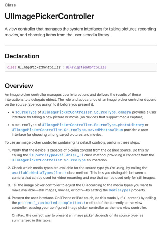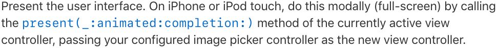 ์ ํฌ๊ฐ ํฝ์ปค ์ปจํธ๋กค๋ฌ๋ฅผ ๋ง๋ค์์ ๋, ์ด๋ฅผ ํ๋ฉด์ ๋์ฐ๋ ๋ฐฉ์์ผ๋ก present ๋ฐฉ์, ์ฆ, ์๋ก ๋ง๋ ๋ทฐ ์ปจํธ๋กค๋ฌ๋ฅผ full screen์ผ๋ก ๋์ฐ๋ ๋ฐฉ๋ฒ์ ์ฌ์ฉํ์ต๋๋ค. ๋คํํ, ์นด๋ฉ๋ผ๋ก ๋์์ ์ฌ์ง์ ๊ฐ์ ธ์ค๋ ๊ฒฝ์ฐ์ฌ์, ์์ง ๊น์ง๋ ๋ฌธ์ ๊ฐ ์์ต๋๋ค.