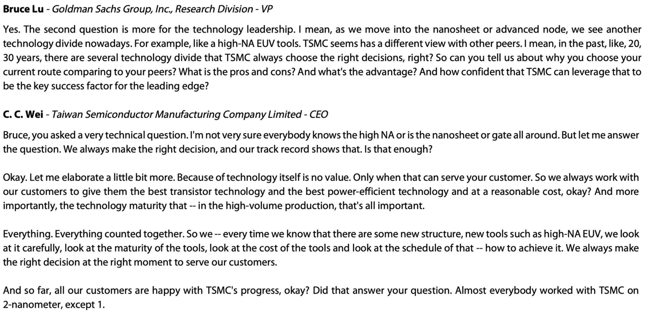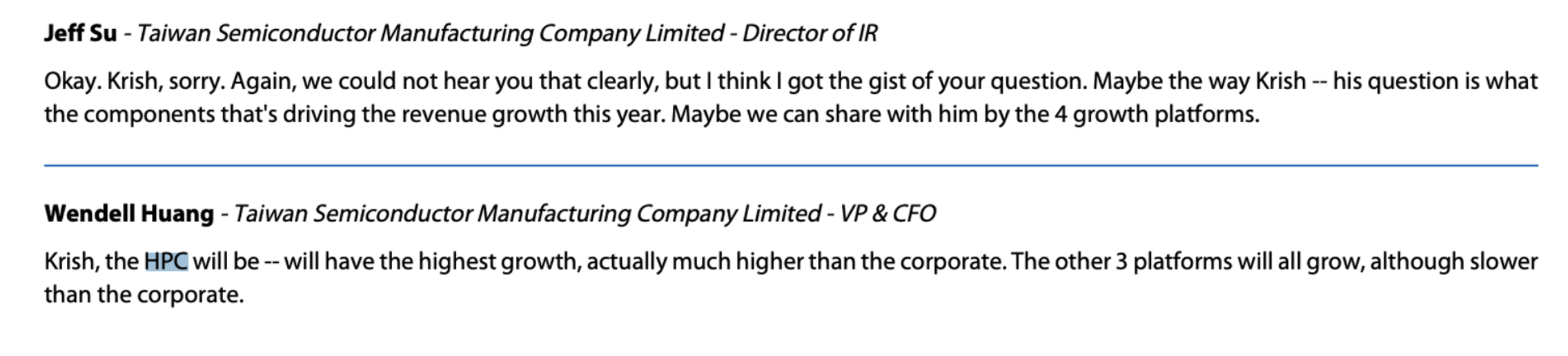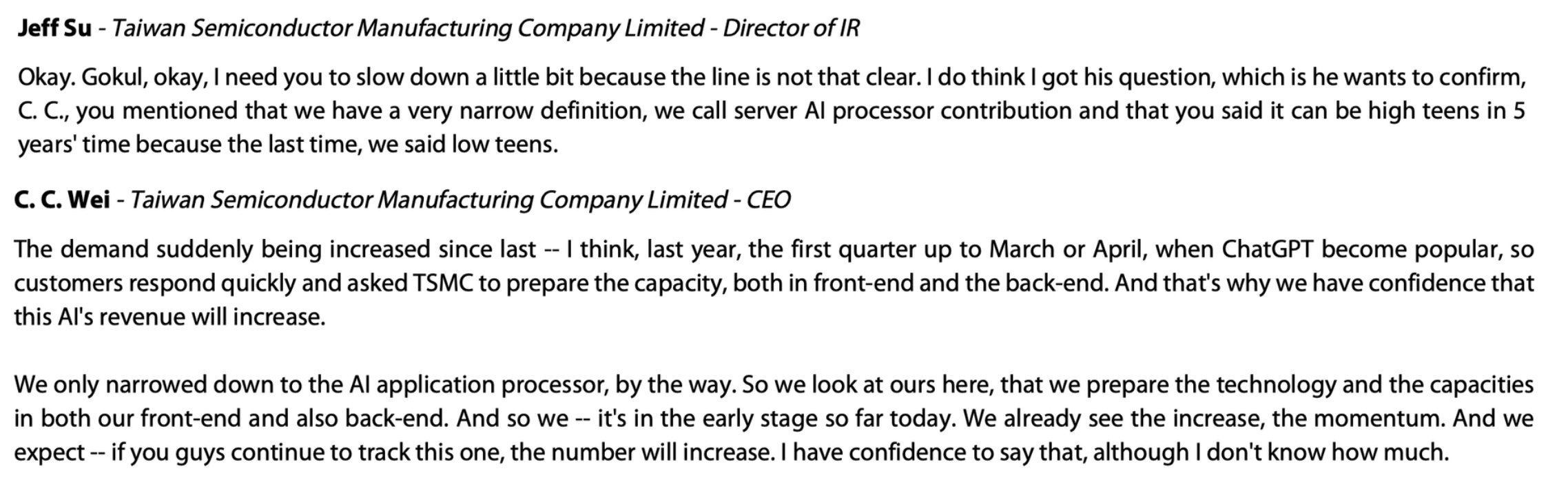 A: chatGPT가 유명새를 타면서, 여러 고객들이 빠르게 반응하기 시작하여, tsmc에 폭풍 주문을 넣기 시작했다. 이쪽 시장은 정말 초기 단계이다. 그리고 우리는 그 모멘텀을 목격하고 있다. 사실 십 후반대도 보수적으로 잡은 수치고 계속해서 올라갈수도 있다. (이쪽 성장세를 본인도 예측할 수가 없다는 뜻..!)