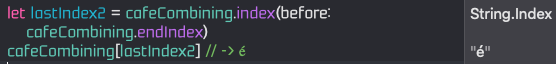 let lastIndex = cafeCombining.index(before: cafeCombining.endIndex) // -> é